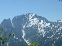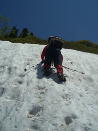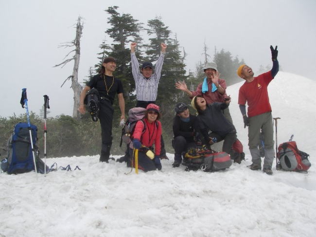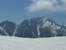 早朝からピーカンで、ずーっと剱岳を眺めながらの登高は、汗を垂らしながらも気分の良いもの。しかし、ここでも、ブヨには悩まされる。大猫平からは一面の雪(残雪)。高度を上げる度に、ガスが濃くなり、山頂に達する頃には、雲中の人になってしまった。