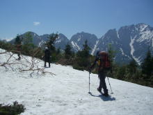 でも、稜線上は、たっぷりの雪量があり、早速テーブル造りの職人が動く。「景色なんぞは、そっちのけ!」 早く席に着き、溜まった話をしなくては・・・ になる。「鬼場倉ノ頭」への誘いにも誰もが乗らず、「ワッハハ」、「ヒッヒヒ」 と、次から次へと出る話が、面白くて楽しくてならなかった。