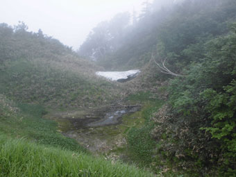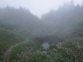 大きな地塘横を通過。ガスが掛かって 分かり難いが、藤井氏の歩きが軽やかである。 |