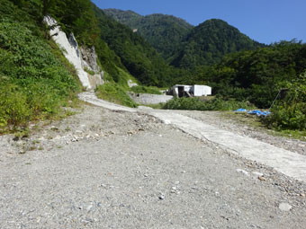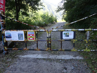 | 砂防工事のため、登山口30分手前にゲート があります。この先、何年続くか分かりません。 |