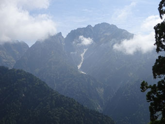 | 時々お目に掛かるT氏をパチリ。 | 1,400mピークから、剱岳を望む。 |