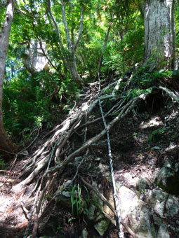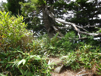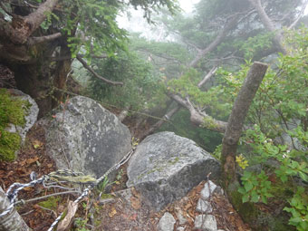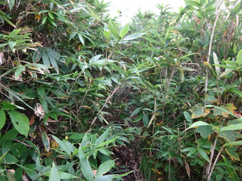 | 1,750m付近の岩や根っこ、ロープのある所。 | 至る所で、笹が登山道に蔓延っていた。 |