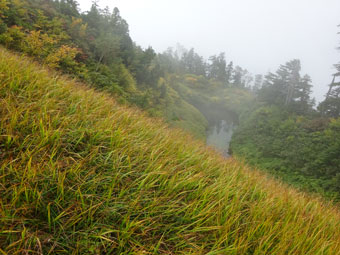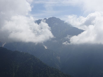 | ようやく、山頂に辿り着きました。 | ガスの切れ間に、猫又山方面の稜線を伺う。 |