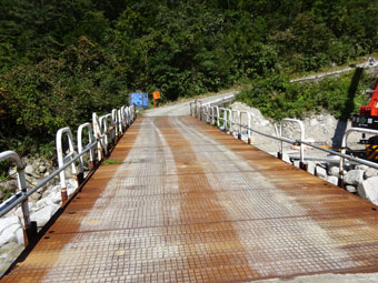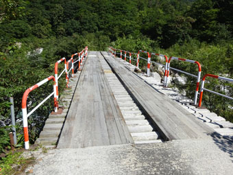 | 白萩川に架かる橋。 | ブナクラ谷に架かる鉄板を敷いた橋。 |
