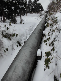 | 貯水池が見えて来た。 | 貯水池を過ぎたら送水管横を行く。 |