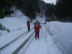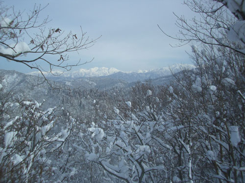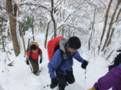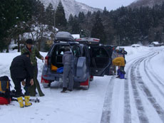 | a.m.8:17 小坂地内に駐車。 | a.m.8:43 しばらく除雪された林道を歩く。 | a.m.9:03 取り付き地点で準備。 |