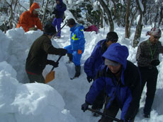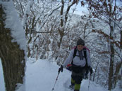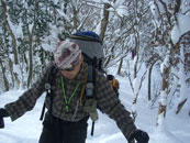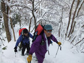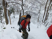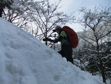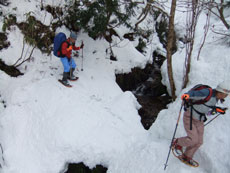 | a.m.9:18 小さなスノーブリッジを渡る。 | a.m.9:19 急登が始まる。 | a.m.9:23 カンジキの北さん苦戦! |