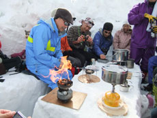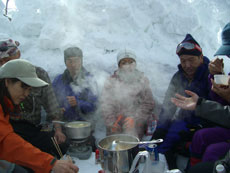 | a.m.11:02 テーブルつくりが始まる。 | a.m.11:23 威力が凄いガソリンストーブ。 | a.m.11:39 温かい食べ物が人気! |