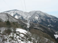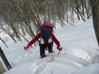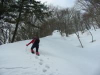 チョット杉林に入るが、すぐにまた広い尾根の雑木林となる。少し雪が硬いがアイゼンを出すほどではない。少し方向が変わるピンクのテープが施してある所で、一息入れるが、「山ノ神」の表情がさえない。二年前の雰囲気と随分違うと言うのである。それはその通りであって、同じ雪山であっても、雪量・雪質が違うのは当たり前である。尾根が狭くなるに連れ、南側の斜面の雪がなくなって来て、とても登りにくく、また笹だ顔を出し滑りにくくなる。後には「キラズ山」が大きく姿を現して来る。