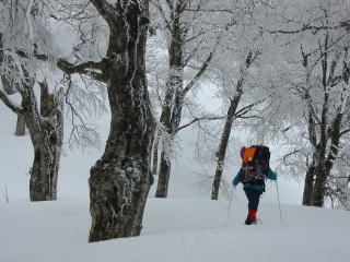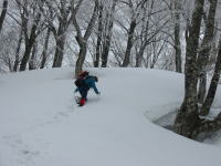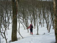 | 「山ノ神」の荷も担いで山頂に向かってブナ林を行く |