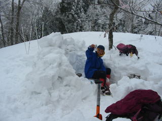 1000mを超えてもうチョットの所で「山ノ神」がダウン。二つのリックを担ぐ羽目になってしまう。頂上で風を防ぐために雪壁を作ったが、まもなく降雪に見舞われてしまった。雪が降ろうが、疲れておろうが、ビールにありつけば、何もかも吹っ飛んで、「山ノ神」は実に満足そうであった。