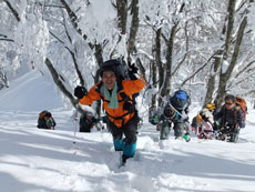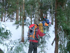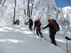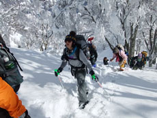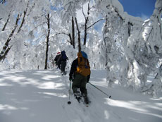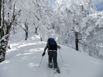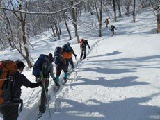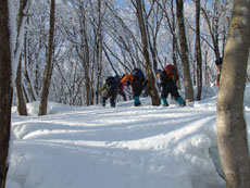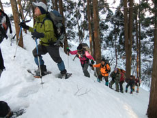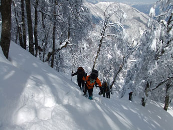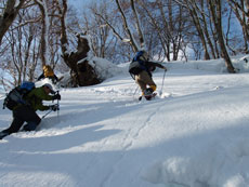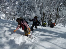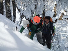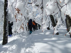 | a.m.10:44 ユキコちゃん先頭に立ってラッセル開始。 | a.m.10:50 急斜面に刃が立たず、トラバース気味に・・・ |