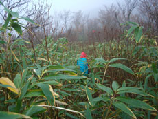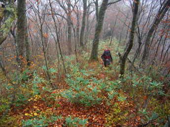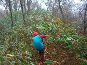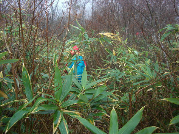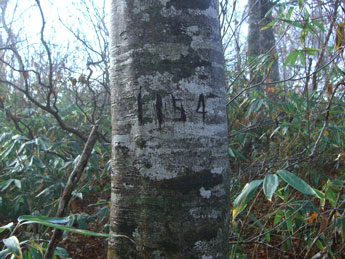 | a.m.9:35 標高点1154mをブナに刻んである。 | 標高1200m位から見通しが悪くなる。 |