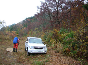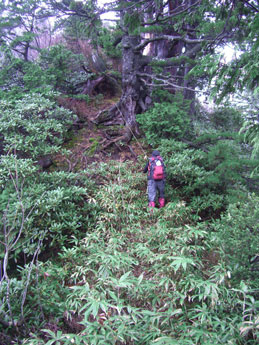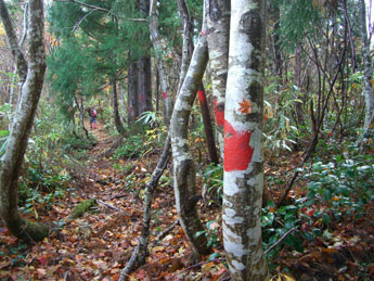 | 40~50分歩くと標識はないが分岐に出る。 | 標識はないが、ベタベタ赤ペンキ印があり、迷う事はない。 |