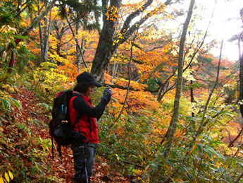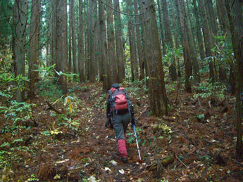 | 紅葉が鮮やかで、思わずシャッターを切る。 | 杉林を行く。 |