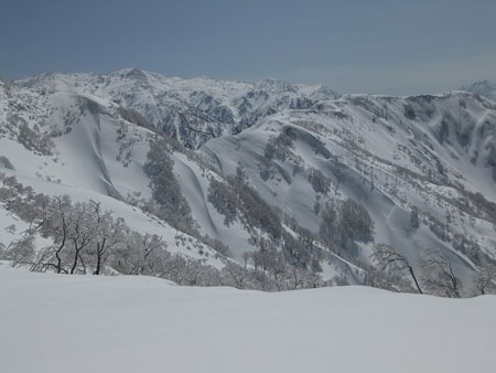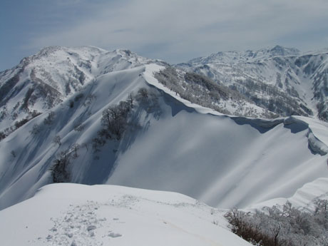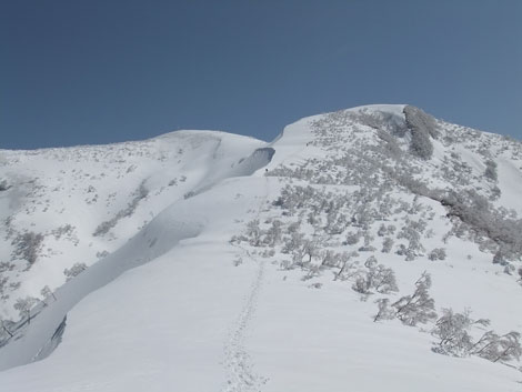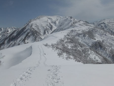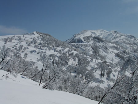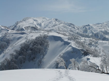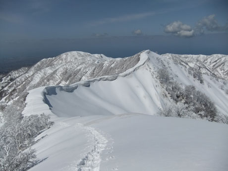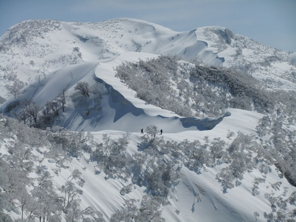 一人で行くとなると、食材から用意しなければならず、夢創塾発が午前7時になってしまった。朝日小川ダムからの合流点でトレースが現れたが、果たして、岩城君と文さんのものか分からない。単独行であるし、樹氷群と戯れながらでも、大地山頂10時には着く事が出来た。