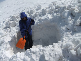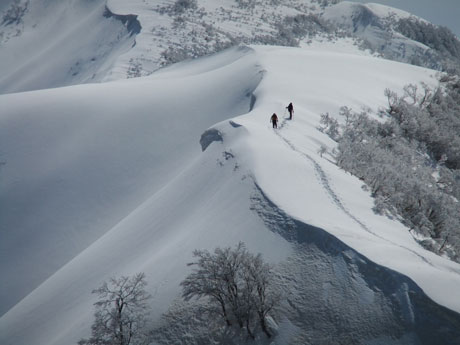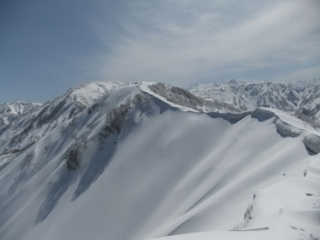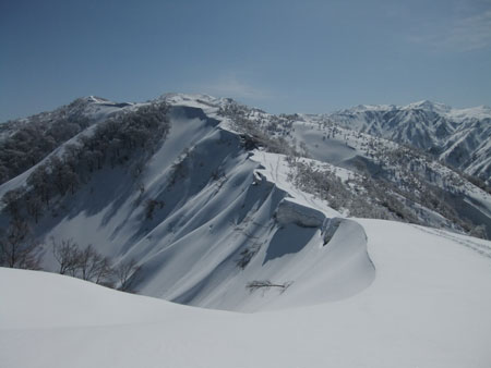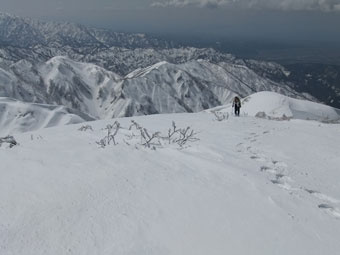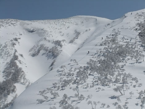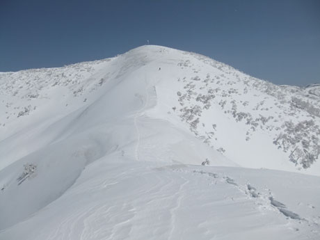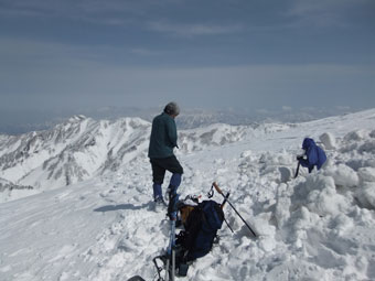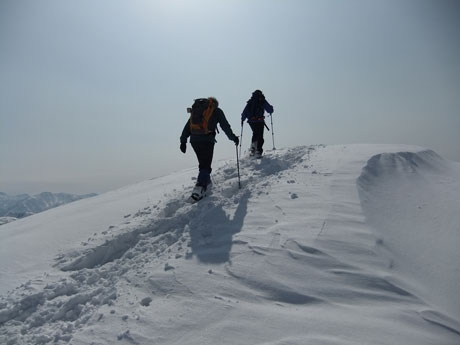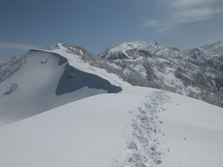 山頂からは、初雪山への途中のピーク(1223㍍萩ノ谷三角点)へ向かう二人を確認し後を追うが、なかなか差が縮まらなかった。山頂直下(白金ノ頭との分岐)でようやく追い着き岩城君と文さんである事が確認出来た。絶景の初雪山頂であったが、いつもの如く、ブリザードのような地吹雪に、いたたまれなくなったが、固い雪にシャベルを立ててしまった。小さくても寒さを凌ぐには充分であった。山頂での拘りは、一人では到底及ぶに至らなかったと思うと、実にハッピーだった。往路は沢山の話が出来て、これもハッピーであった。