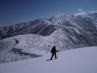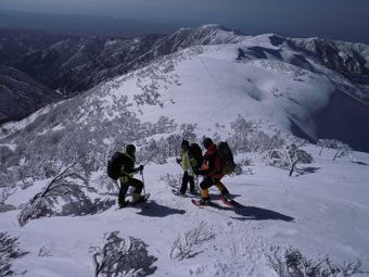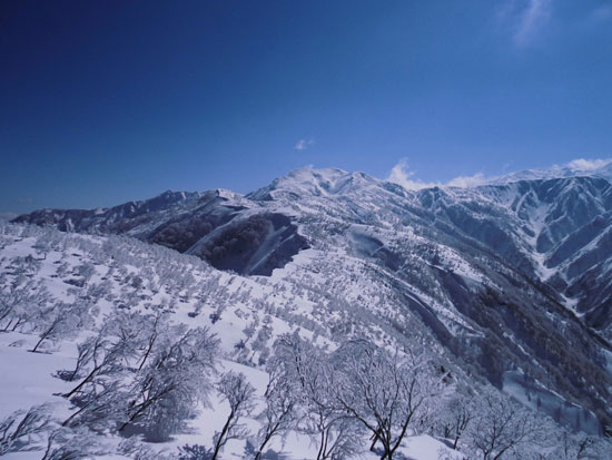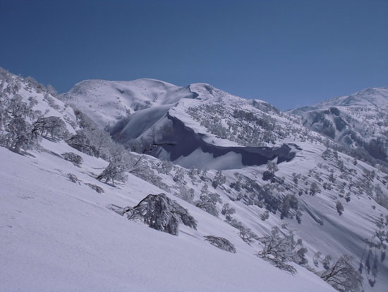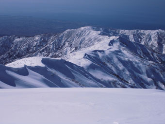 | 10:15 左手に雪庇をみながら・・・ | どちらを見ても、ずっと山並みは澄んでいた。 |