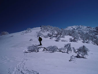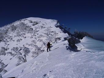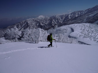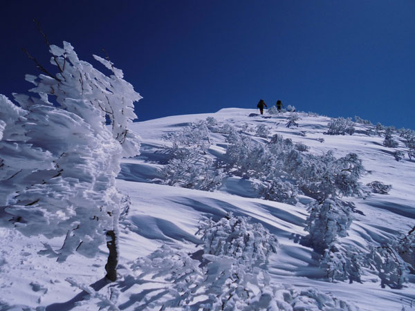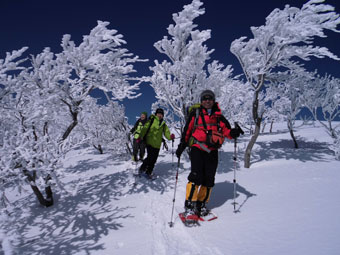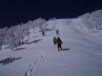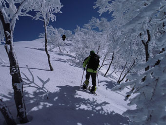 | 10:07 大地山頂から、一気に駈け降りる。 | 10:12 雰囲気の良い樹氷の中を抜ける。 |