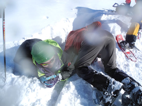 | 14:55 イマイチ女史 不運にも、スノーシューごと、 腰まで深みに嵌ってしまった。 |