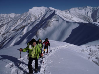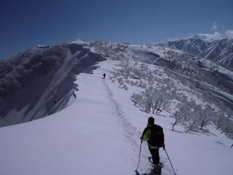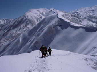 | 10:42 意気揚々。ペースも予定通りである。 | 10:48 いよいよ核心部に突入。しかし、今回は、 雪の状態が良く何の問題もなかった。 |