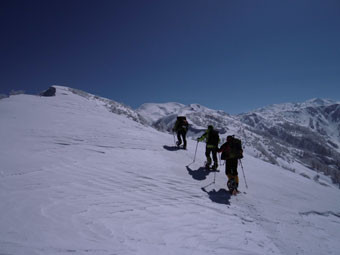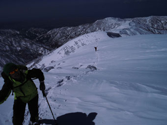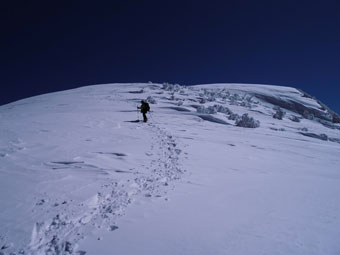 | 10:53 大きな雪庇を避けて・・・ | 11:34 大地から、1時間半程経過。疲れて来る頃。 |