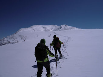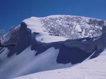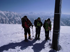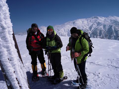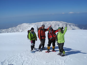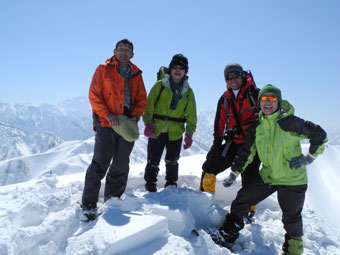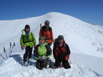 | 12:38~43 初雪山頂をバックに・・・ | 朝日岳をバックに・・・ |