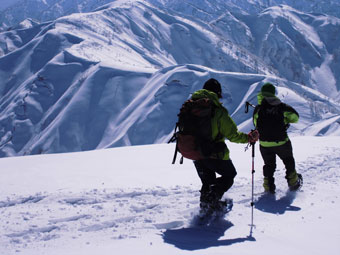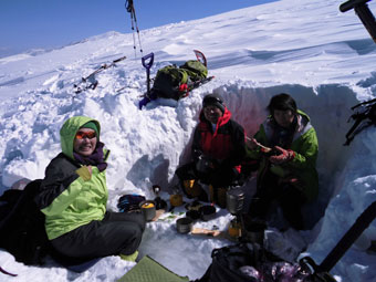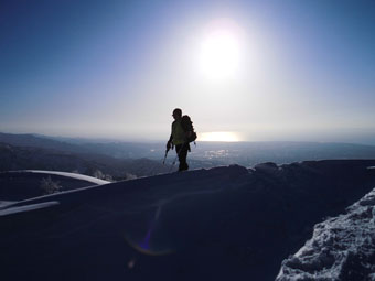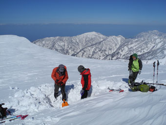 | 固い雪面を掘り起こし、食事処を造る。 | 風は強かったが、初雪山を直に体感したかった。 |