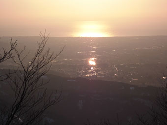 | 16:45 大地から降り始めて・・ | 17:30 鍋倉三角点から、海に落ちる夕陽を眺める。 |