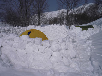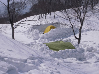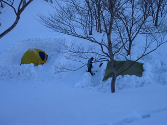 | a.m.6:00 キャンプサイト。 | 予定より遅れたが、初雪山に向かってスタート。 |