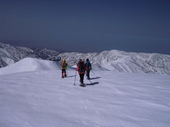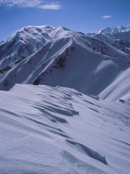 | 大地山に向かって、広い稜線を快適に行く。 | 途中、幾多の雪の造形を楽しむ。 |