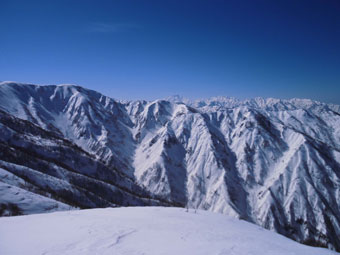 | 「何に見えるかな?」 | 奥に剱岳や毛勝の山々が連なる。 |