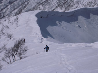 | 何度も初雪山を振り返って眺める。 | 雪庇が発達している最大の難所に近付く。 |