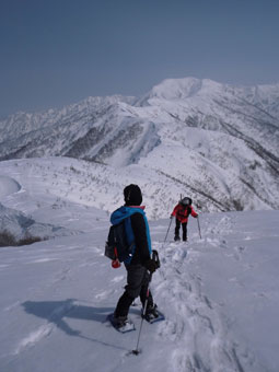 | 風が強い山頂から、すぐに下山。 | 白金ノ頭への稜線をバックに・・ |