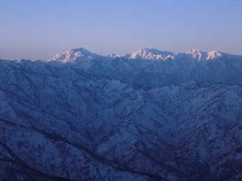 | 陽が昇ってしまった。 | 剱岳や毛勝の山々に陽が当たり出した。 |