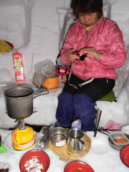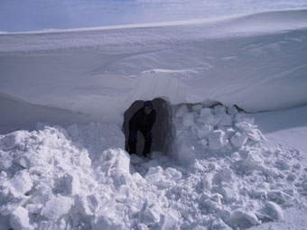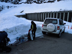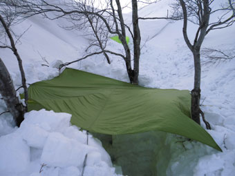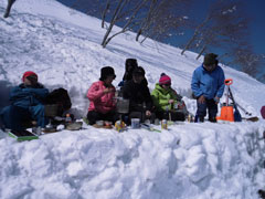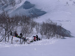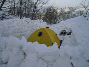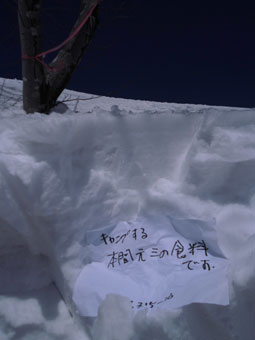 | 初雪山はステキで格好いい! | 食事処は、ちょっと下がって、風を凌ぐ事に |