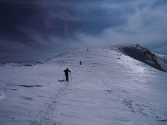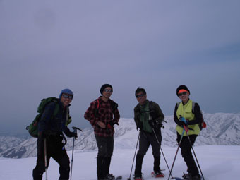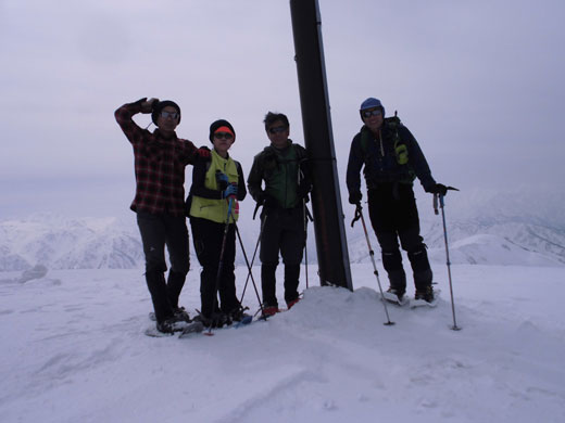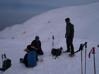 | 初雪山頂で・・・ やっぱり風が強く、すぐに退散。 |