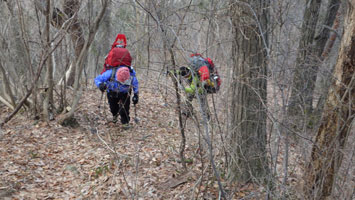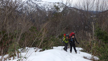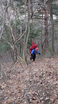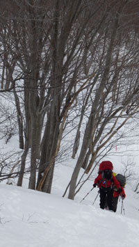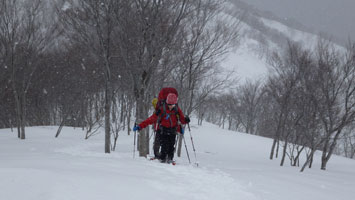 | 夏道に沿っての登高。 | 兵庫からやって来た典ちゃん頑張る。 |