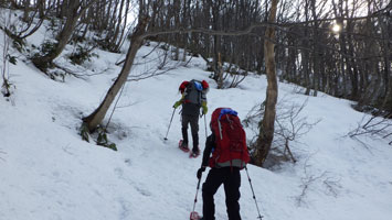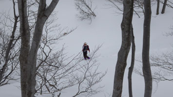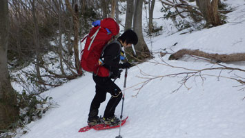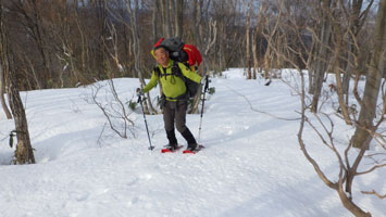 | 赤松に来てようやく雪が出て来た。 | 638m付近の周さん。 |