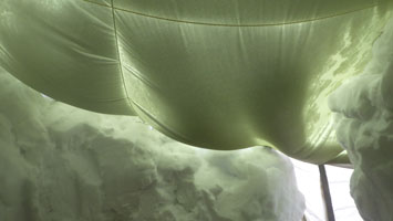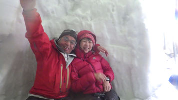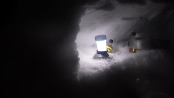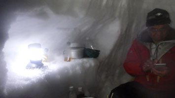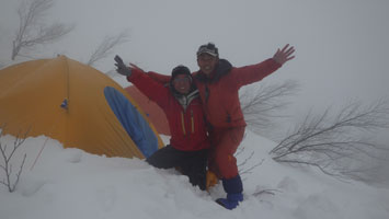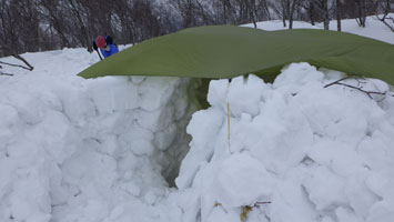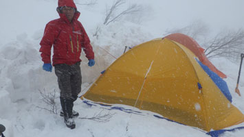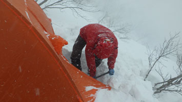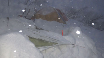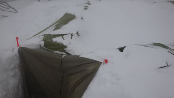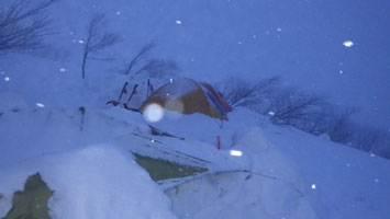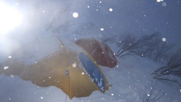 | 最高の気分? | テントの周りに雪が積もり始めた。 |