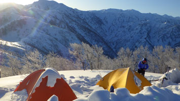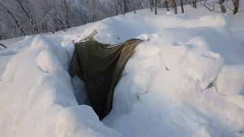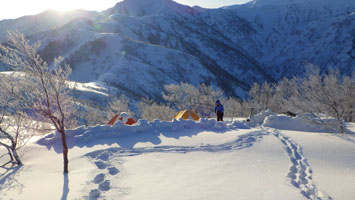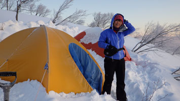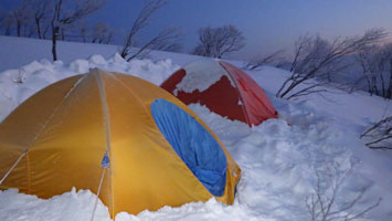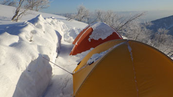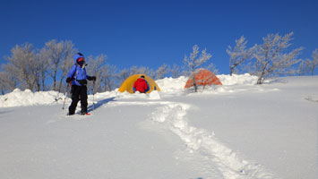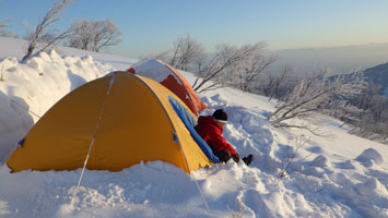 | 山頂付近から、テントサイトの雰囲気を撮る。 | テントを点検! |