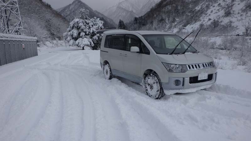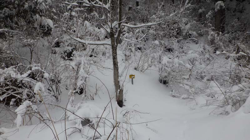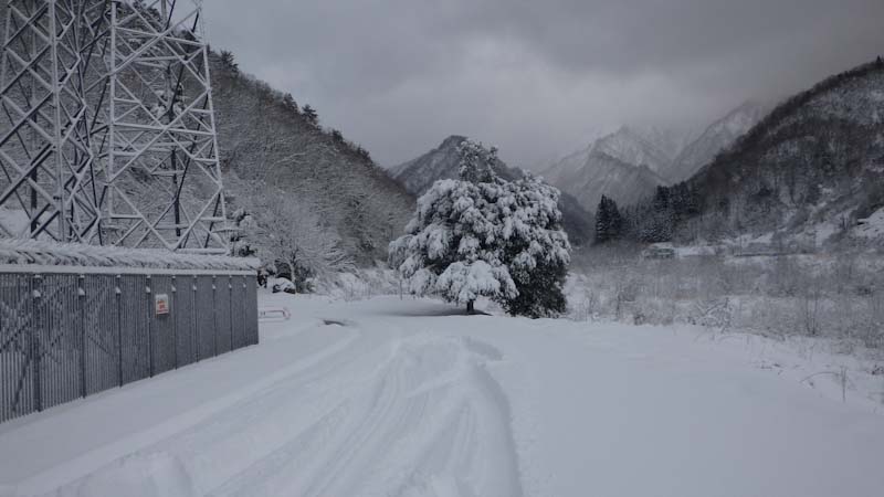 2/9 新川広域農道に入ると除雪車が動いていた。小川温泉への県道もそうであった。朝日小川第2発電所へは、除雪の後の壁が出来ていたが、4WDだけに難なく突破。夢創塾へは行けるような気もしたが、何かあったら困るので自重する。高岡から、ずっと雪が降っていたが、小降りだから雨具を着ず林道を歩き始める。車を止めて来たのが正解であった。