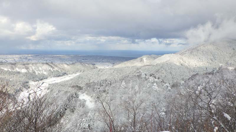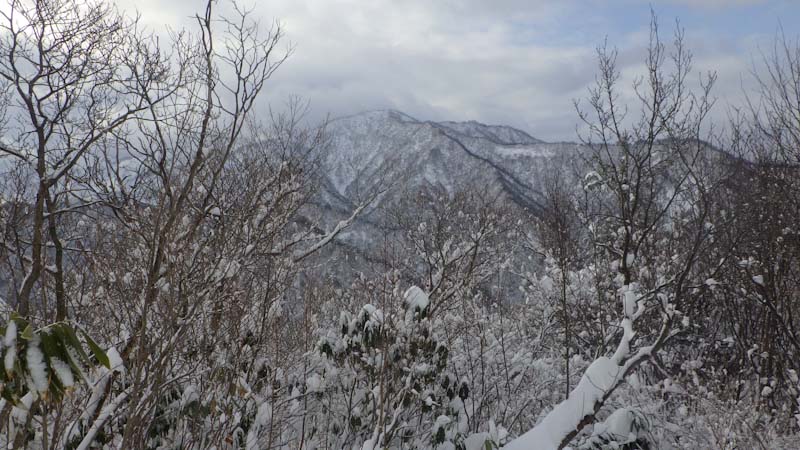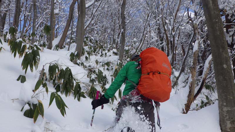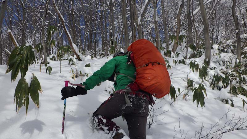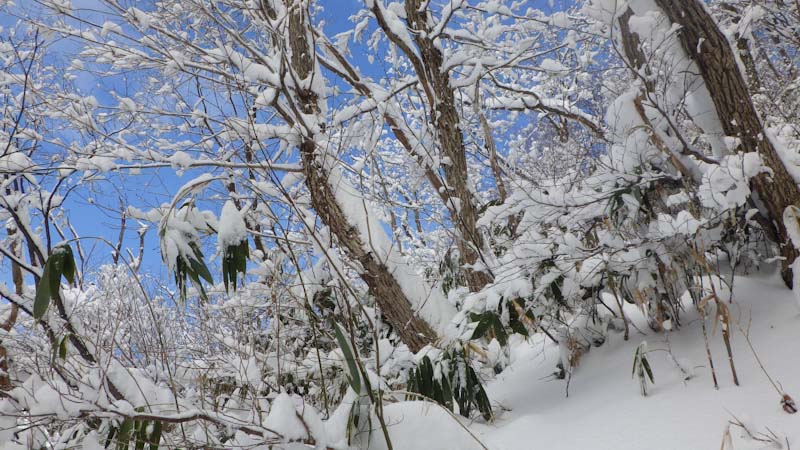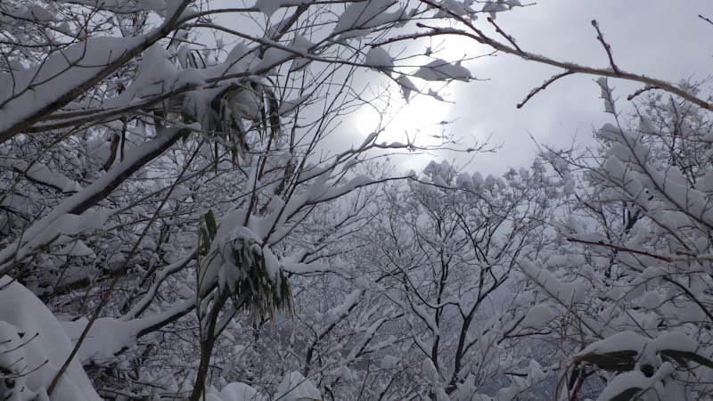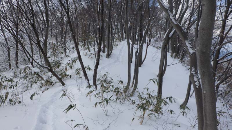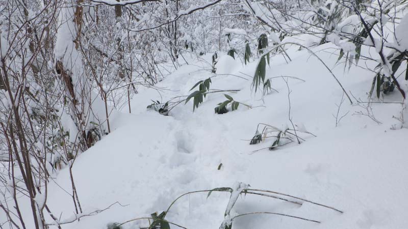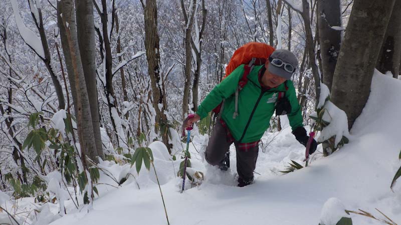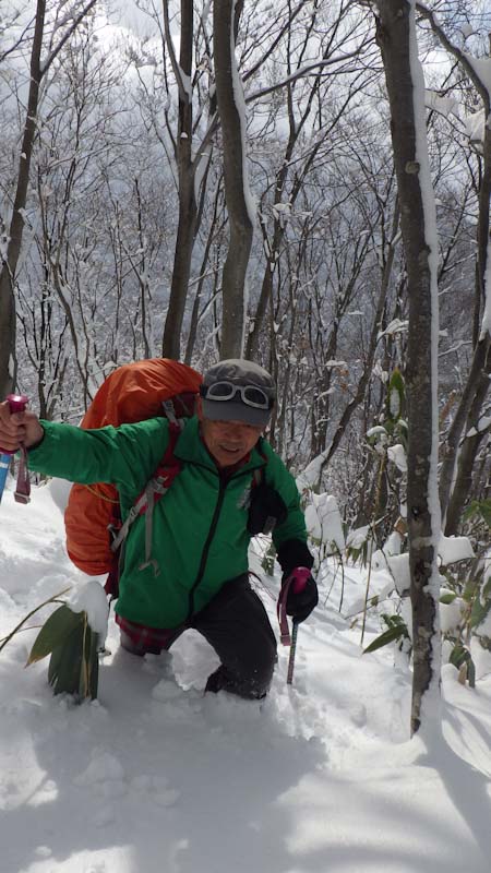 夢創塾からの急登が続くが、今回の降雪の恩恵で、びっしり雪が着いており、スノーシューの威力をまざまざと感じた。林道を含めて赤松の500m地点まで1時間半だったから、まずまずのペースであった。しかし、次の目標の638m地点までがしんどかった。いっぺんに降ったからか、フワフワの雪で、それが笹薮と相まっているのだから、足場が定まらずまるで蟻地獄。赤松から638mまで1時間半掛かった事になる。