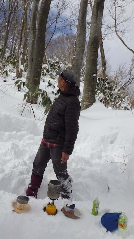 目標をブナ林までと尚も落として30~40分頑張ってみたが、限界を感じ戻る事にした。638mに戻る手前でテーブルを造り食事をし、例の如くコーヒーとした。特別の景色もないが、雪の中での一人ぼっち、少々歳を感じたけれど、そして、あまりにもの敗北・撤退・惨敗 (どの文言が合うのだろう) に、かえってスッキリしたような気もした。