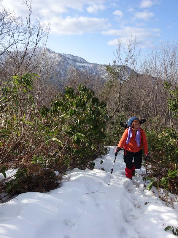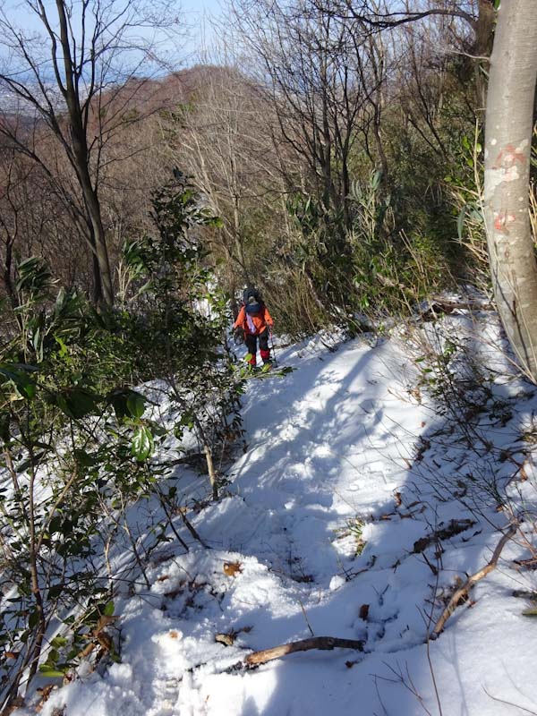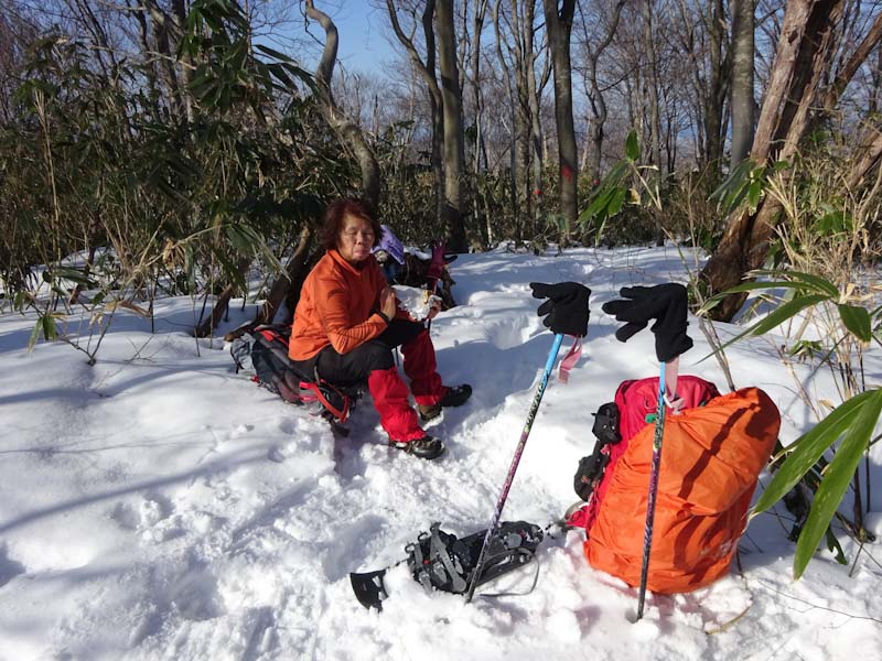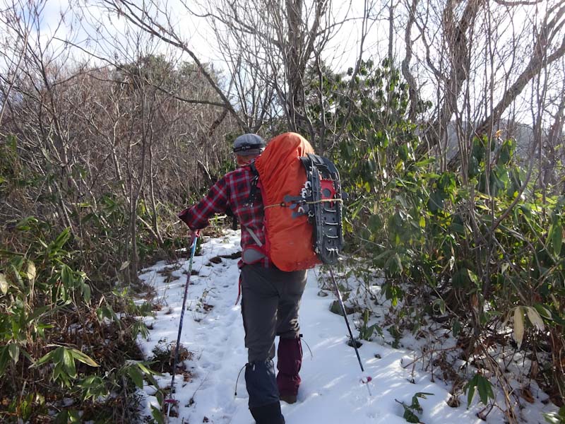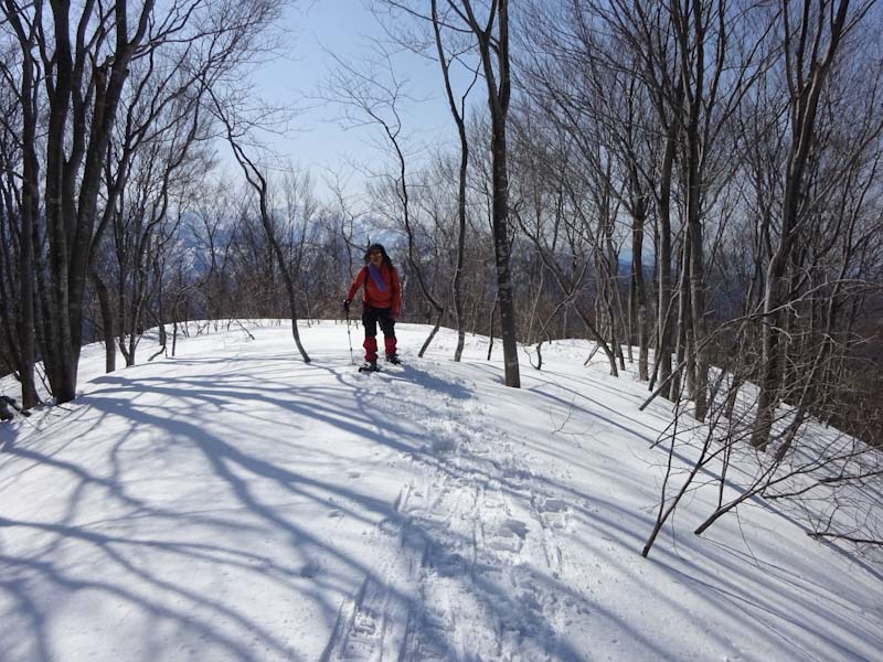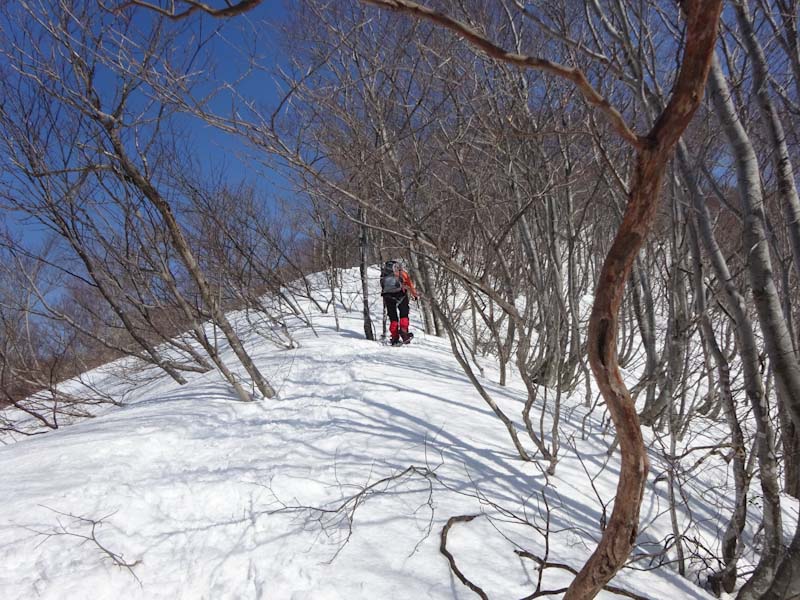 | 「山ノ神」のスノーシューの片方を担ぐ。 | 木々に繋がりながら・・・ |