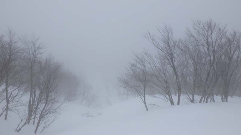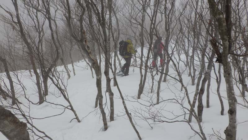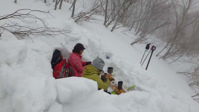 900mちょっと過ぎたくらいの所でコーヒータイムとした。ちょっとお腹が空いていたので、餅やイチゴなどを食べた。この頃まではお天気が良かった。一週間前に歩いた右側のブナ林の尾根に取り付くがトレースがなく気持ちが良い。1000mを超えると、益々雲行きが怪しくなり風も出て来た。