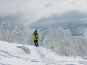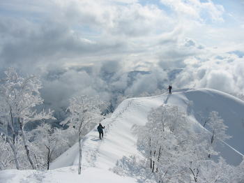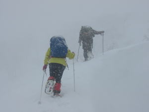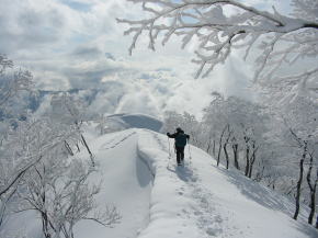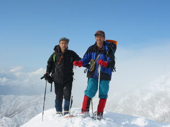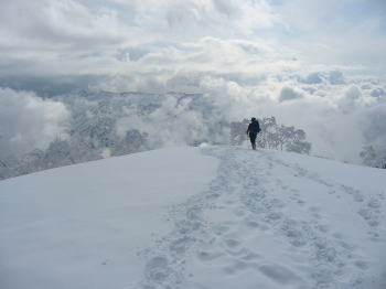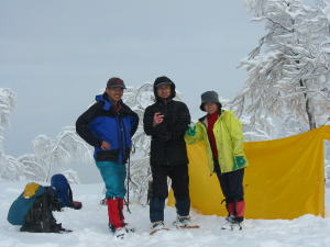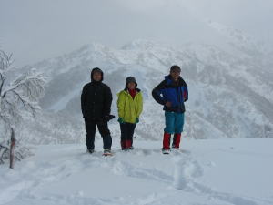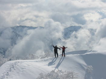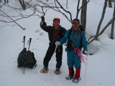 「ヤッホー!」登りは最初から降雪、 帰路は、我慢のし甲斐があって一転青空に |