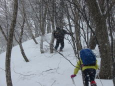 | 迷い易い地点にマーキング | 雪が少なく小枝が邪魔になる | 降雪激しく視界不良! | 山頂近くで・・・・・・・ 今年は雪量が少なく樹木が目立つ! |