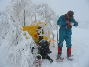 | 降りしきる雪の中、 ツエルトを張って中に逃げ込む |