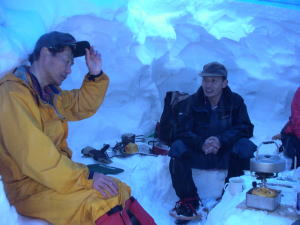 雪洞中では、長勢君のガソリンコンロが威力を発揮し、次から次へと料理が出来上がっていった。我々のガスコンロの威力は見劣りするが、それでも受皿にお湯を注げば、かなり対抗出来るようであった。大地の山中で、3時間も雪洞の中にいるとは、想像もしていなかったが、飲むもの飲まないものを含めて、「宴」は盛り上がっていった。